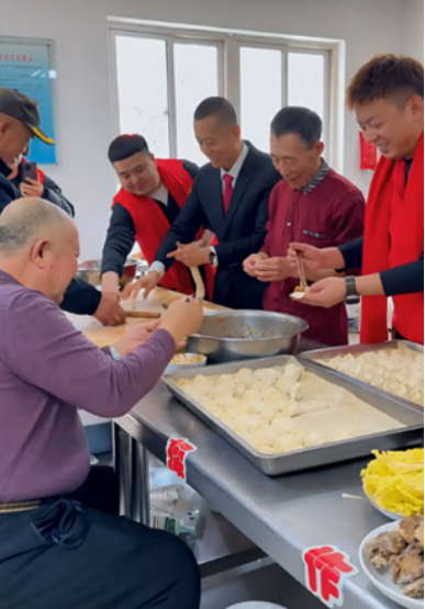 聆听完革命故事,工作人员与老兵们一同包起了饺子。揉面、擀皮、调馅、包捏,大家分工协作,有说有笑。小小的食堂里,热气腾腾的饺子香与浓浓的年味交织在一起,更有一份跨越代际的深情在流淌。老兵们一边包饺子,一边询问团队的日常工作,叮嘱年轻人要珍惜当下、奋发有为。一位老兵笑着说:“跟你们一起包饺子,就像跟自家孩子过年一样。”